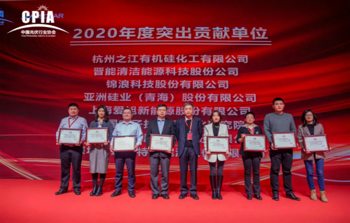 為感謝2020年度在協(xié)會各項會議活動、標(biāo)準(zhǔn)及戶用工作等方面,做出突出貢獻(xiàn)的會員單位,在2020年中國光伏行業(yè)年度大會期間,特授予天合光能股份有限公司、晶澳太陽能科技股份有限公司、晶科能源有限公司、陽光電源股份有限公司、浙江正泰新能源開發(fā)有限公司、隆基綠能科技股份有限公司、華為技術(shù)有限公司、錦州陽光能源有限公司、通威股份有限公司、杭州之江有機(jī)硅化工有限公司、晉能清潔能源科技股份公司、錦浪科技股份有限公司、亞洲硅業(yè)(青海)股份有限公司、上海愛旭新能源股份有限公司、蘇州賽伍應(yīng)用技術(shù)股份有限公司、深圳古瑞瓦特新能源股份有限公司、中國電子技術(shù)標(biāo)準(zhǔn)化研究院17家單位“2020年度突出貢獻(xiàn)獎”。