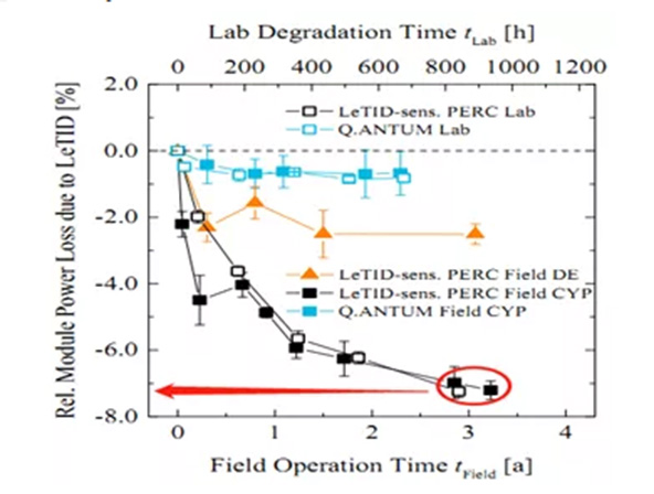 另外Friederike Kersten在論文《System performance loss due to LeTID》公開報道戶外測試結(jié)果,安裝場地位于賽普洛斯,氣候較為溫暖,使用多晶PERC電池組件,運行三年以后的最大衰減為7%左右。