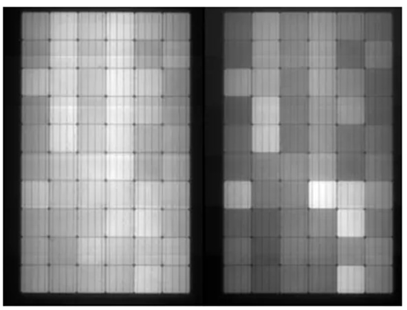 2019年9月,F(xiàn)raunhofer 實驗室MatthiasPander團隊公開發(fā)表了《Prediction of potential power/field lossfrom LeTID susceptible modules》,論文對LeTID組件的功率衰減進行了詳細的研究,如下圖為經(jīng)過690h測試后的單晶PERC組件EL照片,組件內(nèi)部的電池亮度均勻性變差,部分電池已經(jīng)呈現(xiàn)性能衰減。